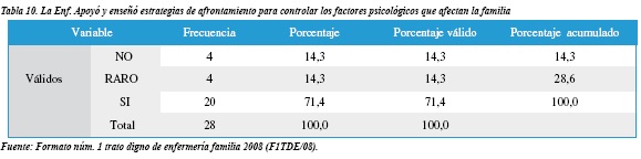Dichos factores fueron detectados por la enfermera familiar mediante el formato de Valoración Familiar y al establecer un plan de acción de cuidados con un acercamiento continuo en las familias se dio apoyo y se mencionó sobre algunas estrategias de afrontamiento en un 71.4% de las familias. (Tabla 10).
