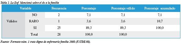 La familia a través del formato de valoración familiar utilizado expresó sus necesidades o inquietudes a la enfermera familiar quedando claro que las familias de paciente con IAM en la UCI son especialmente vulnerables por lo que necesitan de un acercamiento constante por parte del profesional de enfermería. El 100% de las familias presentaron ciertas necesidades como lo fue información, educación y apoyo psico-emocional, esto confirma el diagnostico de enfermería "afrontamiento familiar ineficaz"; determinado en todas las familias mismo que se dio a conocer al 89% de las familias participantes. (Tabla 2).