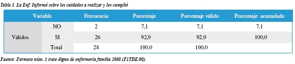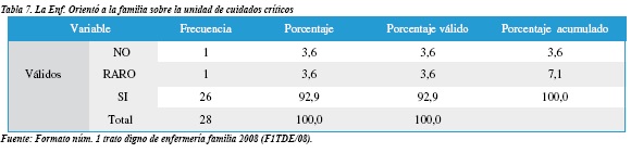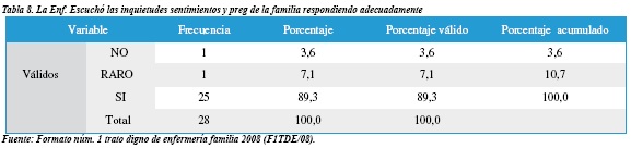 Un 89% de las familias contestaron que la enfermera familiar fue atenta al escuchar las inquietudes y sentimientos referentes a dudas que surgían en el momento sobre cuidados específicos al paciente, aparatos electro médicos existentes en la UCI y sobre normas y horarios de visita, dando respuesta a los mismos durante su estancia hospitalaria.