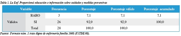 Dichos temas fueron aclarados al 100% de las familias por la enfermera familiar estableciendo estrategias de aprendizaje, utilizando material didáctico y formando grupos de trabajo en colaboración el médico responsable de la unidad y personal de enfermería. (Tabla 5, 6 y 7).
