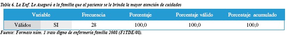 Se observó en el 100% de las familias una alta satisfacción en cuanto al tiempo dedicado por la enfermera familiar en las familias, la comprensión y la exactitud de la información, la atención y el cuidado que se les dio durante su estancia hospitalaria y la habilidad y la competencia de profesionales de enfermería en la UCI.