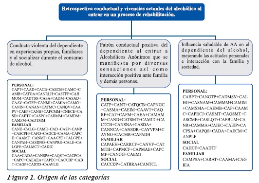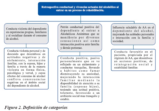 A partir del análisis cualitativo, se concluyó con el desarrollo de una red conceptual en la cual se describe el comportamiento anterior y actual del paciente dependiente del consumo de alcohol en proceso de rehabilitación (Figura 3).