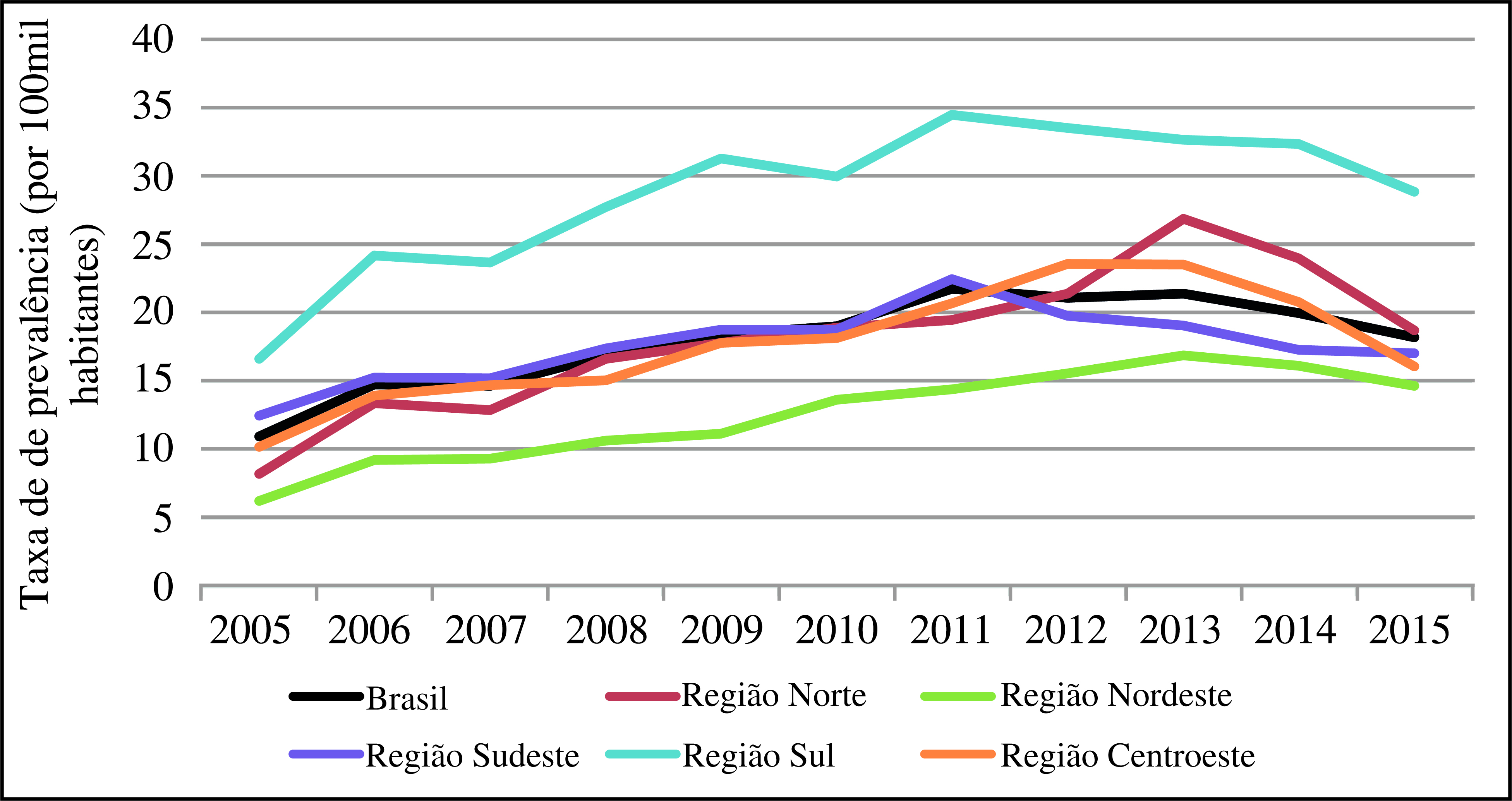 Figura 1 Taxa de prevalência de HIV no Brasil (número de casos por 100mil habitantes), segundo as regiões do país, 2005-2015