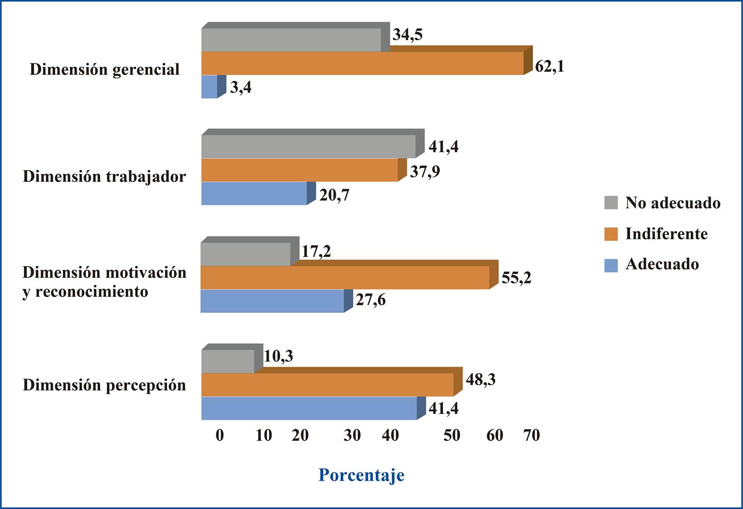 En la Figura 1, se aprecian los resultados que corresponden a las dimensiones de la rotación. En la dimensión gerencial, 62.1% consideró la rotación indiferente, mientras que solo 3.4% la consideró adecuada. En la dimensión trabajador, 41.4% manifestó la rotación como no adecuada. En la dimensión motivación y reconocimiento, 55.2% indicó una rotación indiferente. Y, en la dimensión percepción, 41.4% expresó la rotación como adecuada, mientras que 10.3% la consideró no adecuada y 48.3 indiferente.