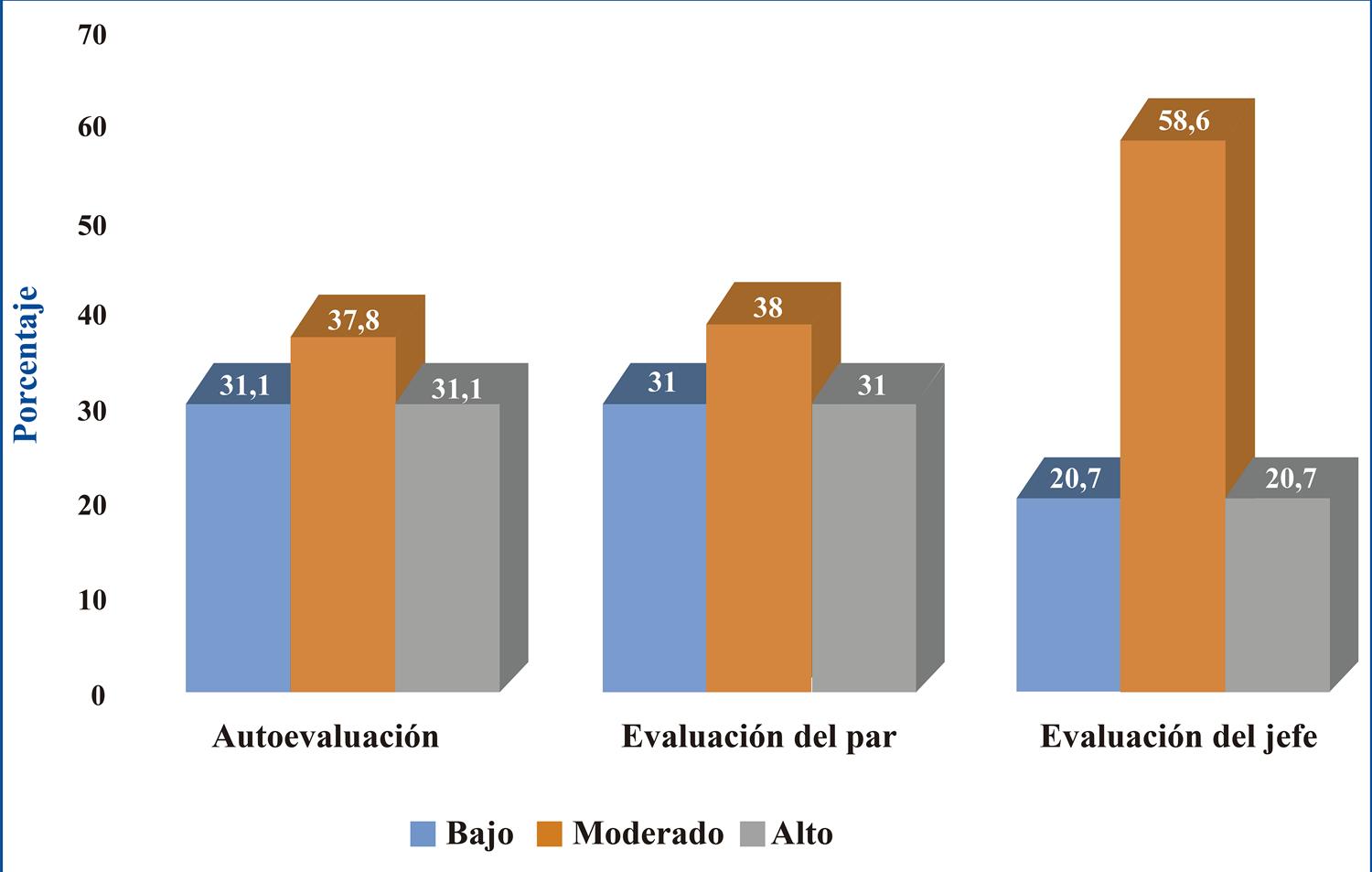 En la Figura 2, se presentan los resultados de la evaluación de desempeño laboral, encontrándose que respecto a la autoevaluación del profesional 37,8% mostraron un desempeño moderado, 31,1% un desempeño bajo y 31,1% un desempeño alto. Respecto a la evaluación de desempeño por parte del par o colega 38,0% obtuvieron un desempeño moderado, 31,0% un desempeño bajo y 31,0% un desempeño alto. Mientras que la evaluación de desempeño realizada por el jefe inmediato evidenció que 58,6% presentaron un desempeño moderado, 20,7% un desempeño bajo y 20,7% un desempeño alto.
