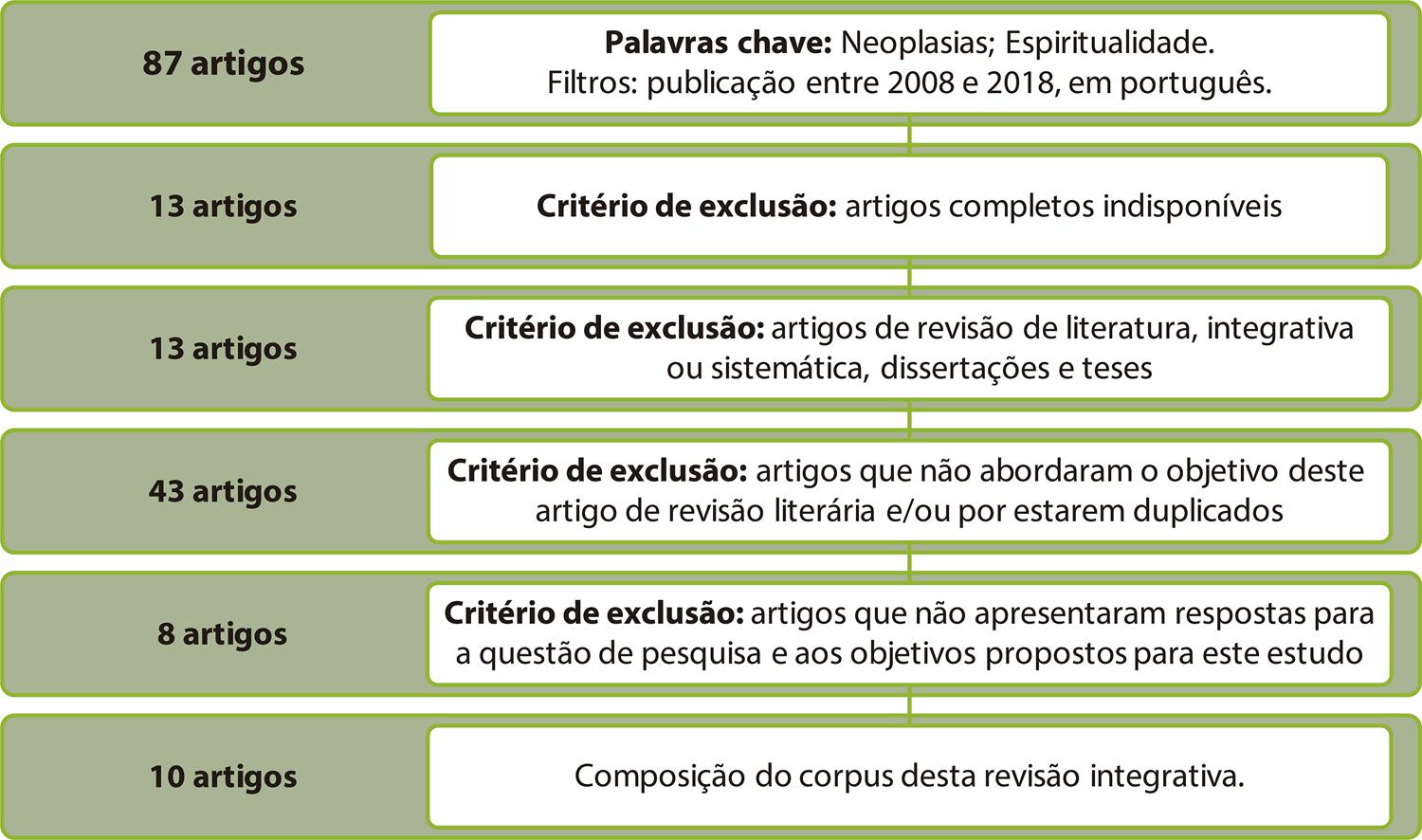 Como revisão integrativa da literatura, população estudada constitui-se de artigos publicados e disponibilizados pela Biblioteca Virtual em Saúde, que abriga as bases de dados LILACS (Literatura Latino-Americana e do Caribe em Ciências da Saúde); BDENF (Base de Dados de Enfermagem); MEDLINE (Literatura Internacional em Ciências da Saúde); e CINAHL (Cummulative Index to Nursing and Allied Health Literature). A busca de artigos na Biblioteca Virtual de Saúde foi realizada em setembro de 2019, utilizando-se os Descritores de Saúde: Neoplasias; Espiritualidade.