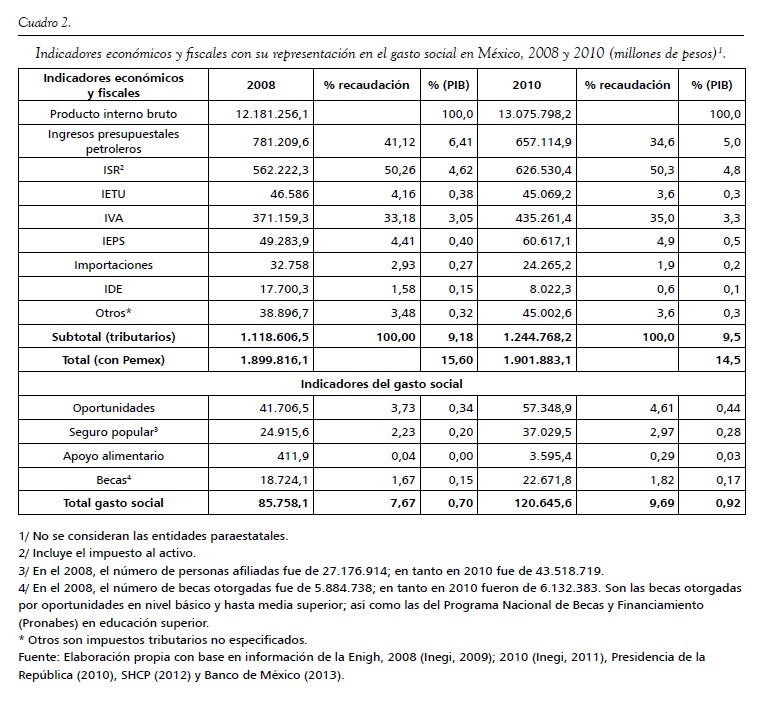 En comparaciones internacionales resulta evidente que gran parte de esta limitación por generar un sistema fiscal fuerte proviene de los impuestos indirectos. México recauda tan solo la mitad del promedio de la OCDE, observado para este tipo de contribuciones. En términos de impuestos específicos, la recaudación es incluso inferior a un punto porcentual del PIB, una de las menores de América Latina. En lo que se refiere al IVA, su reducida capacidad contributiva está asociada con una estructura de tratamientos preferenciales que facilitan evasiones. Por otra parte, los ingresos tributarios provenientes de los impuestos directos registran en México un nivel similar al del promedio de países de América Latina. Un análisis realizado en un trabajo para la Cepal detalla que los impuestos de base amplia que componen a la estructura impositiva directa permite comprobar que México mantiene un nivel recaudatorio similar al de otros países de la región (Alvarez, 2008).