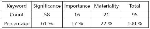 The FASB Accounting Standards Codification™ Professional View (the Codification) provided by Financial Accounting Foundation (FAF) and the American Accounting Association (AAA) enable us to identify keywords related to materiality concept in accounting practices. To identify the materiality indications in the Codification, we use the keywords: materiality, importance and significance or some of these words derivations such as material, important, significant. From the listed codifications on the year 2010, only 95 indicate some implications of materiality. These are less than 10 % of the codifications (consistent with Thompson, et. al., 1990). The following table summarizes the count and the percentage of each keyword.