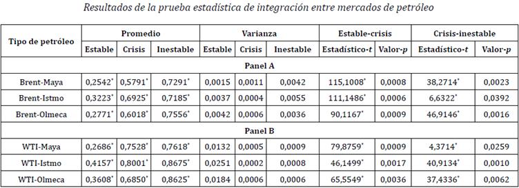 En esta sección se prueba la existencia de integración entre los mercados de petróleo de referencia internacional y el mercado de petróleo mexicano, con base en el estadístico-t. Esta prueba estadística indica que la hipótesis nula de que las correlaciones se mantienen significativamente altas y con la misma intensidad durante el periodo de crisis con respecto a las correlaciones de los periodos de estabilidad e inestabilidad. Para una validación estadística más robusta, el valor-p bootstrap de la prueba de integración se estima generando 10.000 replicaciones bootstrap estacionarias para cada una de las correlaciones de los periodos.