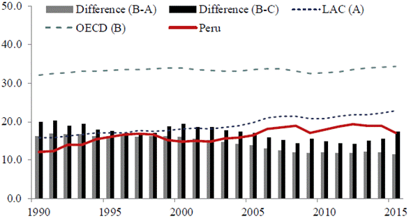 It is relevant to note that the tendency to increase tax revenue in Peru during the period from 1990 to 2013 follows a behavioral pattern similar to that observed in all Latin America and appears to be mainly the result of favorable macroeconomic conditions and, to a lesser degree, of changes implemented in tax regimes and the strengthening of tax administrations, conditions that did not exist during the 1980s (OECD/ECLAC/CIAT/IDB, 2017). Thus, the gap between tax revenue in Peru and the remaining countries in Latin America as compared to the OECD has been diminishing. In 2000, this gap equaled 19.8 percentage points, and by 2013, it decreased by 4%.