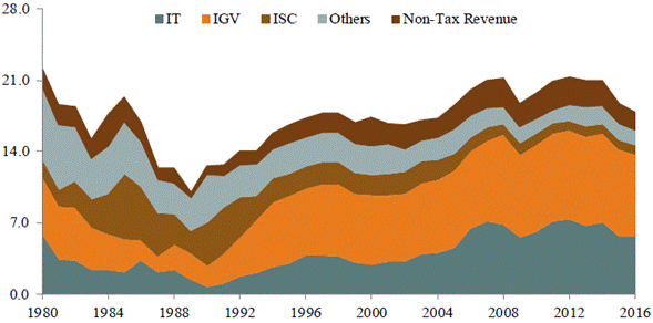 One of the most useful measures to compare tax compliance among countries is the ratio of tax revenues as percentage of the Gross Domestic Product (GDP). Henceforth we call this the "tax-to-GDP ratio". Tello (2002) indicated that at the beginning of the 1980s, due to a certain degree of stability with respect to the tax-to-GDP ratio, the collection of the selective consumer tax (ISC, for its acronym in Spanish)-especially as applied to fuel-began to take on greater importance, whereas the collection of the income tax (IT)3 and the value-added tax known in Peru as general sales tax (IGV, for its acronym in Spanish) began to register a decrease. In the case of IT, an excessive number of processing steps and multiple deductions hindered its administration. This situation revealed the necessity for a reform of the tax collection system.