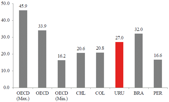 Note: The OECD country that collects the most (least) is Denmark (Mexico). For Brazil, Chile, Colombia, Uruguay, and the OECD, the tax potential values obtained belong to the findings of Caceres et al. (2015). For Peru, the values are estimates based on the data obtained in Table 1.