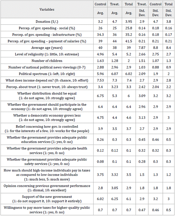 Table 3 presents the descriptive statistics for the main variables of the experiment. The first two variables are donation to the Peruvian government (treatment) and to the non-profit institution (control), in which we observe that individuals (on average) are more willing to donate to the Peruvian government (S/. 4.7) than to the non-profit institution (S/. 3.2).