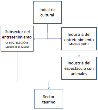 La industria taurina española tiene un peso importante en las industrias culturales. García et al. (2001) realizan uno de los primeros análisis de la industria cultural taurina. No solo la definen, sino que, además, realizan una clasificación de esta. Entre las industrias relevantes dentro del sector cultural se ubica el sector taurino que, en ocasiones, ha sido catalogado como subsector del entretenimiento (Lasuén et al., 2005). Martínez (2011) incluye la industria taurina en la industria de los espectáculos con animales dentro de una estructura sectorial como es la de la "industria del entretenimiento". Teniendo en cuenta la economía de la cultura, este sector se incluiría en las artes escénicas. La tauromaquia se considera una expresión artística en vivo (Suárez et al., 2021). Peltoniemi (2011), sin embargo, no contempla la industria cultural taurina (Figura 1).