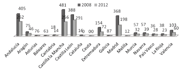 Se observa que las comunidades que más festejos celebraron entre 2008 y 2012 fueron Andalucía, Castilla la Mancha, Castilla León y Madrid. Esto se debe a dos factores: el número de plazas de toros y la considerable tradición taurina existente (Figura 4).