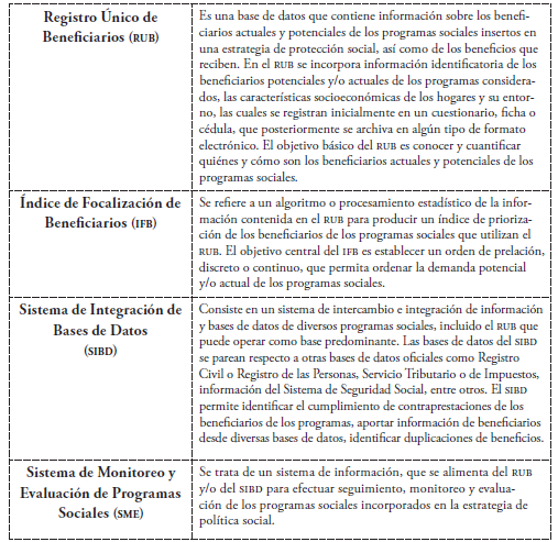 La focalización -en cualquiera de sus modalidades- exigió que los potenciales destinatarios estuvieran claramente identificados, lo que implicó disponer de bases de datos certeras y actualizadas a fin de seleccionar la población receptora, así como desarrollar actividades de recuento de población y sus condiciones socioeconómicas. Entonces, para focalizar las intervenciones sociales hacia los más pobres, debían saber quiénes eran, dónde estaban, cuáles eran sus características y qué necesidades insatisfechas tenían; por lo tanto, estimularon el desarrollo de un sistema de información que contuviera esos datos y se recurrió a los Sistemas Únicos de Información de Beneficiarios -en adelante, SUIB-, cuyos componentes se presentan en la tabla 2.