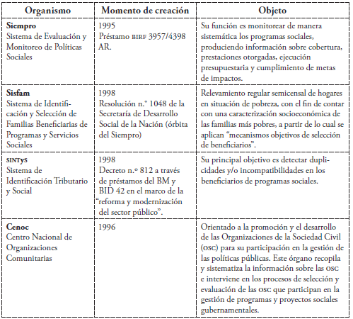 Para el cumplimiento de sus funciones, se transfirió al CNCPS un conjunto de estructuras destinadas a la construcción de sistemas de información en el área social, que fueron creados a través de préstamos del BM durante la década de 1990 y que luego, en el nuevo siglo, se constituyeron en órganos estables dentro de la estructura estatal (Ciolli 2016).
