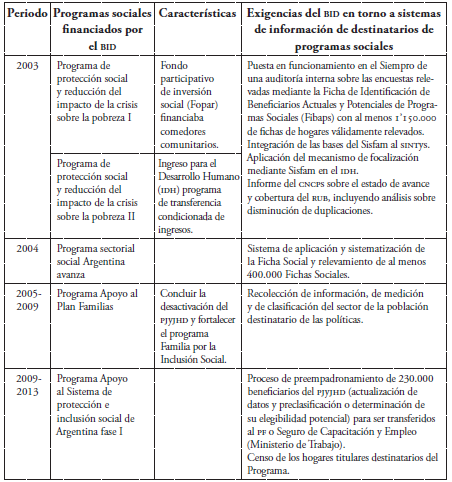 A continuación, la tabla 4 presenta las exigencias del BID con relación a sistemas de información de destinatarios de programas sociales en el caso de cinco programas financiados por este organismo internacional durante el periodo de estudio. La información contenida en el cuadro aporta argumentos para sostener, por un lado, la distancia entre el discurso oficial y la práctica en torno al distanciamiento con los organismos de asistencia financiera y técnica; por el otro, el fortalecimiento de los sistemas de registro de beneficiarios y la utilización del mismo para la selección de los destinatarios de las políticas durante la posconvertibilidad.