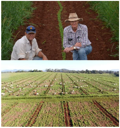 The Goshen site consists of infertile red-earth soils. The Blennerhassetts purchased a heavy-duty Norseman twin-row leucaena planter with precision depth control (Figure 1) and leucaena was sown in February and March 2018 in twin rows (900 mm apart) with inter-row spacing of 10 m. Placing seed at 15‒25 mm depth reduced time to emergence and improved overall establishment in comparison with planting at depths >30 mm under the same conditions. Approximately 56 ha of Redlands was successfully established at Goshen. Performance of this stand will be observed in comparison with a 40 ha stand of the psyllid-prone cultivar Cunningham, which pre-dates the Redlands planting.