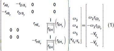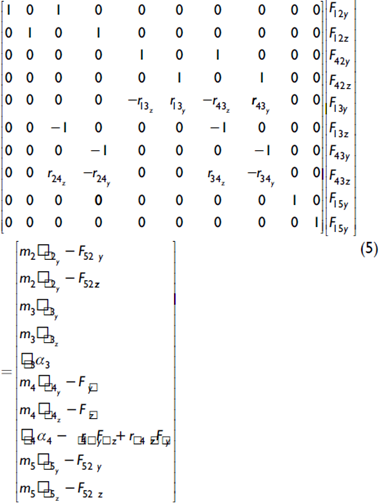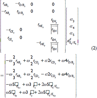 Luego, mediante el análisis de las aceleraciones se obtiene la matriz de solución para las aceleraciones angulares de los eslabones que conforman el mecanismo de la suspensión: