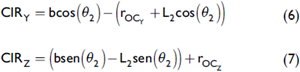 Donde b es la longitud de la línea que unen los puntos CIR y P;θ2 es el ángulo formado entre la línea horizontal y b; rocY y rocz son las componentes del vector que define el punto material C dentro del sistema de coordenadas global; L 2 es la longitud del brazo inferior de suspensión y CIRy y CIRz son las componentes del vector que define el centro instantáneo de rotación dentro del sistema de coordenadas global.