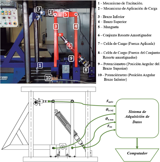 Figura 10 Banco de pruebas para el análisis dinámico de la suspensión de un vehículo y representación del sistema de adquisición de los datos medidos