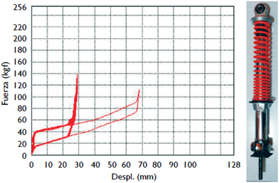 Con la información suministrada por estos dos ensayos fue posible caracterizar al conjunto resorte-amortiguador, obteniéndose la constante de rigidez elástica y los coeficientes de amortiguamiento en los recorridos de acortamiento y alargamiento, respectivamente.