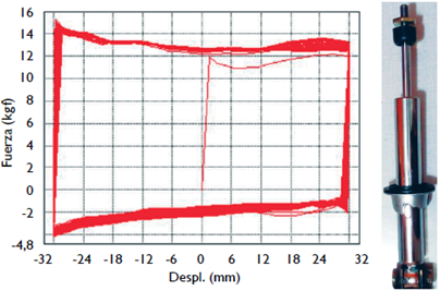 Para el segundo ensayo, se aplicó de nuevo un movimiento cíclico, pero ahora solo sobre el amortiguador (el resorte fue removido). La figura 12 muestra la fuerza ejercida en los recorridos de acortamiento (bump) y alargamiento (rebound) en función del desplazamiento (el primero de ellos con una fuerza mayor). Este segundo ensayo se hizo con las mismas condiciones del primero.