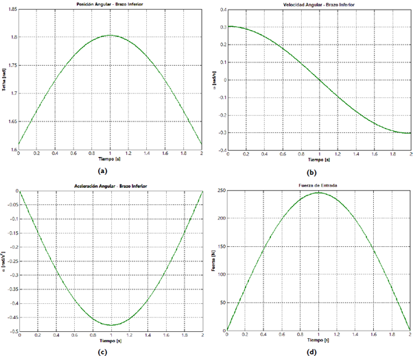 El comportamiento de la posición, velocidad y aceleración angulares del brazo inferior descritas por el modelo teórico es similar al encontrado con las señales cinemáticas de entrada (posición angular y sus dos primeras derivadas) del modelo físico. Esto se corrobora con los porcentajes de variación límite, los cuales para la velocidad angular no exceden en ningún caso el 16% y para la aceleración angular no superan el 27%.