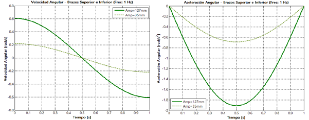 En las figuras 16 y 17 se muestra el comportamiento de la velocidad y aceleración angulares de los brazos superior e inferior, para los dos niveles de la amplitud de la oscilación y los dos niveles de frecuencia, respectivamente.