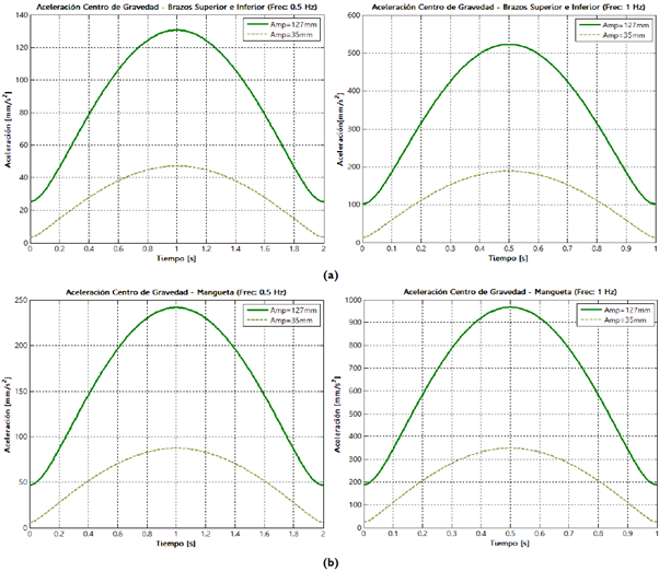 Figura 18 Comportamiento de las aceleraciones de los centros de masa para: (a) brazos superior e inferior y (b) mangueta