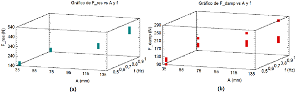 Por último, en la figura 29 aparecen los comportamientos de las fuerzas máximas ejercidas por el resorte (a) y el amortiguador (b), respectivamente, en función de la amplitud y la frecuencia de la oscilación, de acuerdo con el arreglo experimental definido.