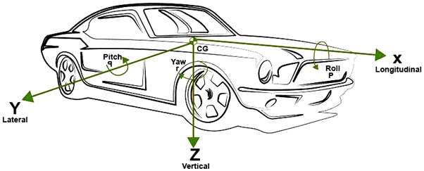 Figura 3 Sistema coordenado definido por la SAE y los ángulos de giro pitch, roll y yaw de un vehículo