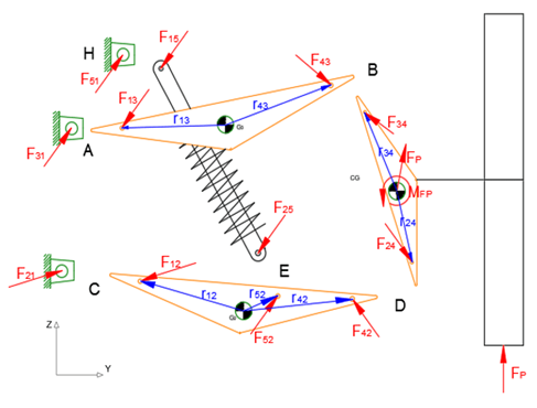 El análisis de fuerzas en los pares cinemáticos se realiza basado en Norton (2013). El método de solución es el newtoniano y se aplican las leyes de movimiento para un mecanismo plano mediante las expresiones: