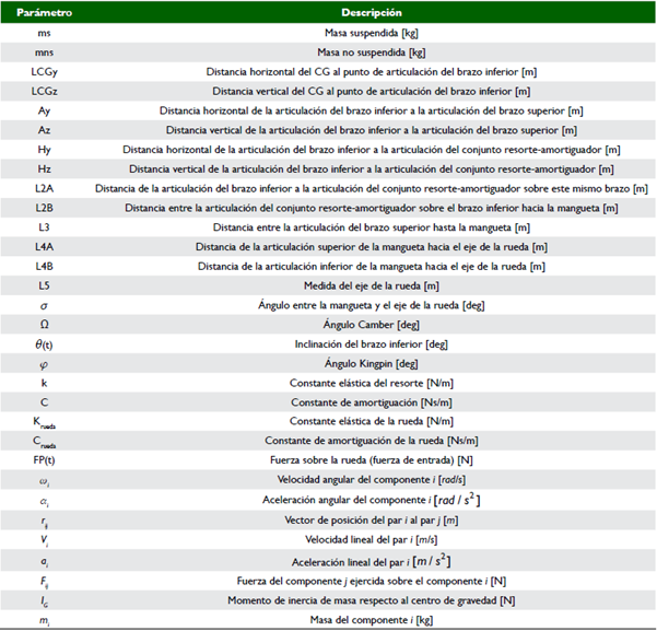 El modelo teórico del fenómeno se plantea con % de vehículo, para ello se han considerado modelos previos desarrollados por Rojas y Arzola (2013), Thacker (2015) y por Yu, Evangelou y Dini (2017); ya que cada configuración de suspensión tiene sus propios pros y contras cuando se trata de ganancias de inclinación respecto al centro de balanceo e inclinación debido al movimiento vertical de la rueda (bump y rebound) (Schommer, Soliman, Farias & Martins, 2015). Este modelo teórico puede desarrollarse para cualquier tipo de configuración geométrica de una suspensión de doble horquilla; esto contempla, por ejemplo, suspensiones con brazos paralelos e iguales, paralelos y con la misma inclinación, paralelos no iguales, y brazos convergentes o divergentes con longitudes de brazos diferentes. En la figura 5 se muestran los parámetros geométricos de la configuración de la suspensión de doble horquilla, mientras que las variables asociadas a los esquemas mostrados anteriormente se encuentran descritas en la tabla 2.