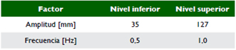 Debido a las condiciones de operación que se quieren estudiar, el diseño experimental es basado en un arreglo factorial completo, de dos factores con dos niveles cada uno. Este tipo de diseño permite el estudio del efecto conjunto de los factores amplitud y frecuencia del movimiento sobre las respuestas dinámicas de la suspensión.
