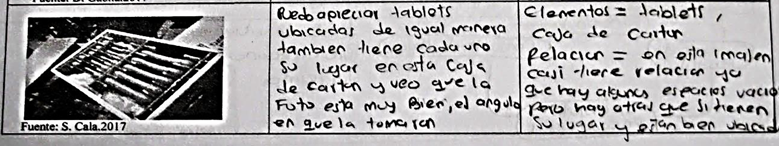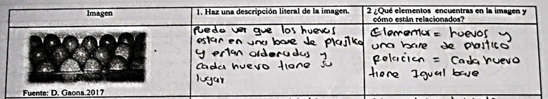 Inicialmente, en este tipo de ejercicios, a los estudiantes, aunque reconocen los elementos en cada fotografía, se les dificulta expresar con sus palabras lo que ven en las imágenes, les falta fluidez verbal, muestran timidez y falta de confianza para dar a conocer sus apreciaciones. A medida que se implementaban las guías-taller, el proceso de descripción literal mejoró: los estudiantes mostraron más organización en sus producciones y describieron más detalles de las imágenes presentadas. En cuanto al proceso de reconocimiento de patrones, establecieron regularidades y dieron argumentos con mayor fluidez. A partir de las fotografías, se propusieron ejercicios para elaborar diferentes conceptos relacionados con la variación. En esta parte del proceso, los estudiantes respondieron a preguntas planteadas con respecto a los procesos IFI y VP. Las situaciones matemáticas que componen las guías-taller se diseñaron para que los estudiantes observen la imagen y con el razonamiento visual, determinen los elementos que se encuentran en ella y establezcan regularidades.
