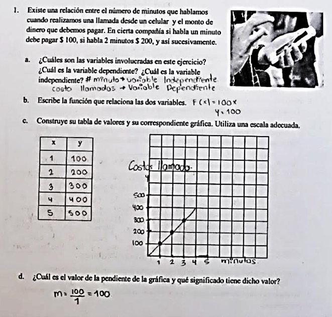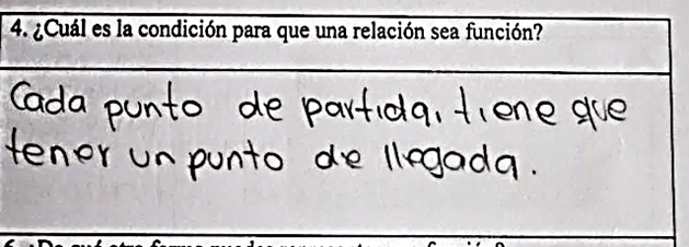 En este momento del estudio, los estudiantes establecen relaciones entre las diferentes formas de expresar una función; se muestran más seguros del proceso; demuestran que conocen y manejan los conceptos; su capacidad de argumentar la ponen en juego en la solución de los ejercicios. En el desarrollo de las actividades se nota el progreso en cuanto al desempeño en la solución de situaciones matemáticas y la aplicación de los procesos de visualización IFI, VP y representaciones externas. El uso de la fotografía es favorable en la elaboración de representaciones mentales, pues recuerdan y asocian los conceptos con la solución de situaciones y demuestran que han afianzado el proceso de visualización; utilizan el lenguaje matemático a la hora de describir relaciones y han entrado en el proceso formal de modelación. En las figuras 3, 4, 5, 6 y 7 se muestran evidencias de los avances presentados por algunos estudiantes en el proceso de representación externa.