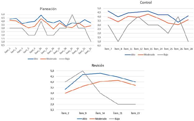 El análisis del cuestionario evidenció tres niveles de perfil de aprendiz estratégico entre los estudiantes observados. Los niveles se obtuvieron a partir del promedio de las puntuaciones asignadas a las respuestas dadas por los estudiantes en los 28 ítems: no lo considero así (1), pocas veces lo considero así (2), en mi caso la mitad de las veces (3), casi siempre lo considero así (4) o me refleja perfectamente (5). Se consideró con perfil alto aquellos estudiantes que en la mayoría de los ítems de las tres habilidades estudiadas obtuvo valoraciones superiores o iguales a cuatro, con moderado perfil aquellos estudiantes que en la mayoría de los ítems obtuvo valoraciones mayores o iguales a tres y menores que cuatro y con bajo perfil aquellos estudiantes que en la mayoría de los ítems obtuvo valoraciones menores que tres (véase figura 1).