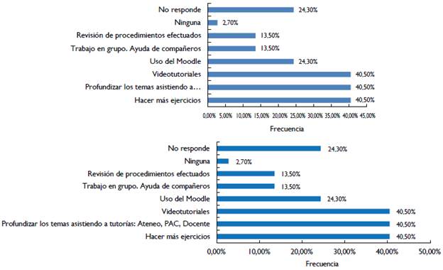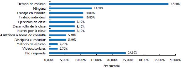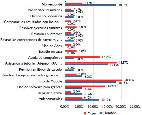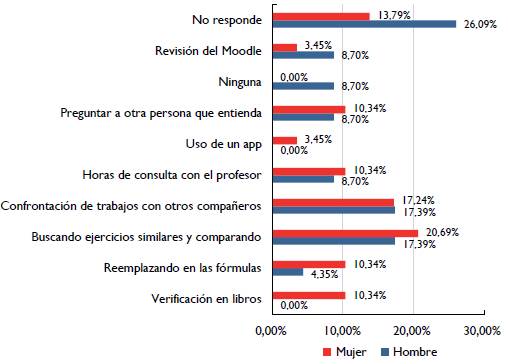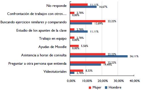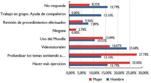 Respecto a la evaluación, los estudiantes manifestaron usar diferentes estrategias para realizarla. Sin embargo, la estrategia de revisión más marcada fue la del uso del curso implementado en la plataforma Moodle, lo que permite inferir la importancia que empezó a tomar el uso del apoyo virtual como estrategia de aprendizaje de los estudiantes, con mayor énfasis en mujeres que en hombres. En cuanto a la forma en que pretendían superar las dificultadas presentadas, señalaron la intención de asistir a consultas, realizar más ejercicios y ver videotutoriales (que se encontraban dentro del curso en la plataforma Moodle). Además, cabe resaltar el deseo de los estudiantes por aumentar la cantidad de tiempo dedicado al estudio, como una estrategia de cambio con respecto a la planeación para nuevos conocimientos.
