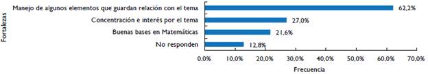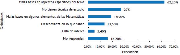Incluso con la barrera anterior, el instrumento utilizado para observar desde lo que se planea, intentó identificar las fortalezas, debilidades y estrategias de estudio con las que el estudiante cuenta para el abordaje del tema de funciones y sus gráficas. Se encontró que las fortalezas que se identifican con mayor frecuencia son: el manejo de algunos elementos que guardan relación con el tema (62,2%) y concentración e interés por el tema (27%) (véase figura 3), como dato que llama la atención, de alguna manera las cifras parecen sugerir una contradicción en lo que se responde a la pregunta realizada por las debilidades; el 62,2% señalan tener malas bases en aspectos específicos del tema y 27% afirman no tener técnica de estudio (véase figura 4).