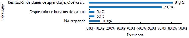 También se preguntó a los estudiantes por las estrategias de estudio que usarían para facilitar el repaso o aprendizaje de funciones y sus gráficas. El 81,1% de los estudiantes en el proceso de observación muestran argumentos actitudinales positivos al señalar la intensión de realizar planes de aprendizaje: qué va a hacer y cómo lo llevará a cabo, así como el 70,3% ven la necesidad de incluir estrategias de estudio (véase figura 5).