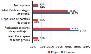 Se encontró que sin importar si el estudiante es hombre o mujer, el grupo manifiesta estrategias similares (véase figura 6). Por tanto, se tienen argumentos que sugieren la condición de aprendices estratégicos, aunque un tanto fuera de los tiempos requeridos.