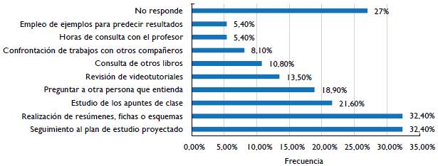 Se encontró diversidad en las respuestas que se generaron para este aspecto. Sin embargo, las estrategias de mayor uso, detectadas en el grupo investigado, fueron: seguimiento al plan de estudios proyectado (32,4%), realización de resúmenes, fichas o esquemas (32,4%) y estudio de los apuntes de la clase (21,6%). Llama la atención encontrar que, en el grupo observado, se prefiere hacer preguntas de verificación o aclaración a sus mismos pares (18,9%) que hacer la consulta directamente con el profesor, así como también la revisión de videotutoriales (13,5%) (véase figura 7).