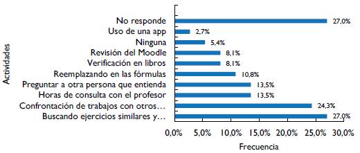 Con el propósito de ahondar en el seguimiento y supervisión a las diferentes actividades que se implementarían para el desarrollo de la asignatura, fue de interés para esta investigación identificar las actividades de verificación desarrolladas por los estudiantes. En este sentido, se preguntó en formato de tipo abierto: ¿qué tipo de actividades desarrolló para verificar si el procedimiento o algoritmo que estaba utilizando durante el desarrollo de los ejercicios o problemas era el correcto?