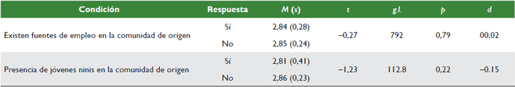 Por otro lado, al evaluar si los puntajes de motivación por servicio comunitario varían según la disponibilidad percibida de oportunidades laborales, los individuos que respondieron que en su comunidad existen fuentes de empleo (M = 2,84, s = 0,28) reportan puntajes estadísticamente similares a quienes niegan la existencia de oportunidades laborales (M = 2,85, s = 0,24), t (792) = -0,27, p = 0,79. El tamaño del efecto entre estas diferencias es muy bajo (d = 00,02). Además, los puntajes de motivación para el servicio comunitario no difieren según la presencia percibida de personas que ninis en el lugar de origen, t (112,8) = -1,23, p = ,22, d = -0,16 (tabla 2). Esta motivación tampoco se relaciona con la percepción de violencia presente en la comunidad de origen, r = -0,02, p = 0,56, 95 % IC [-0,09, 0,05].
