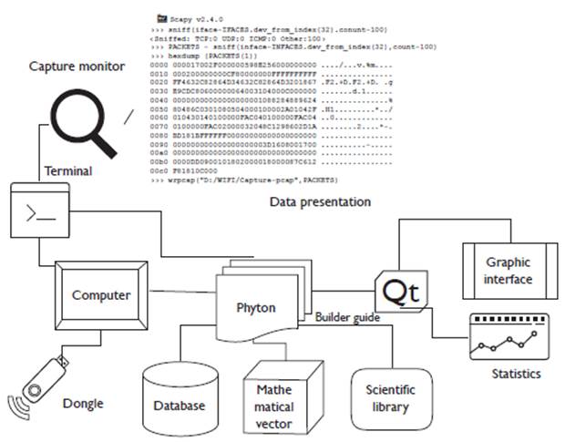 with Npcap, the hardware is established in monitor mode, and with Scapy (Rodofile et al., 2015), the capture is executed from the wireless physical interface in a text file with extension .pcap, which contains the extracted data in real time. The tools mentioned above are integrated with the Pyqt5 application (Harwani, 2018) for the presentation and visualization of the graphic interface designed.