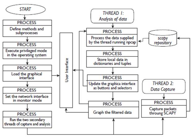 Initially the methods used in the application are defined, then the console or terminal is used to establish the network card in monitor mode accessible to the user (Günther et al., 2014) in order to capture the control and management frames within the header of the link layer and the resources of the operating system, on which the application is running. Next, the graphic interface is loaded where two programming threads (subprocesses) are started simultaneously, one for data analysis and the other for the capture of the beacos frames.
