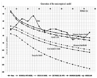 When confronting the semi-empirical model obtained with the propagation models Okumura-Hata and COST 231-Hata; it is observed that the Okumura-Hata model is based on measurements for mobile macro cell systems, for distances between the mobile and the base station between 1 and 20 kilometres. Define the expressions for four different environments, urban dense and urban medium, suburban and rural; for the case of the urban environment, it uses the general equation (6) for losses, where Lurb (dB) are the decibel losses using the expression of Yacoub (2019).