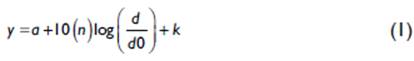 Assuming that: a is the trajectory losses at a reference distance, n the exposure of losses, d the distance of each measurement, d0 is the reference distance, and k is the error of sensitivity of the random effects.